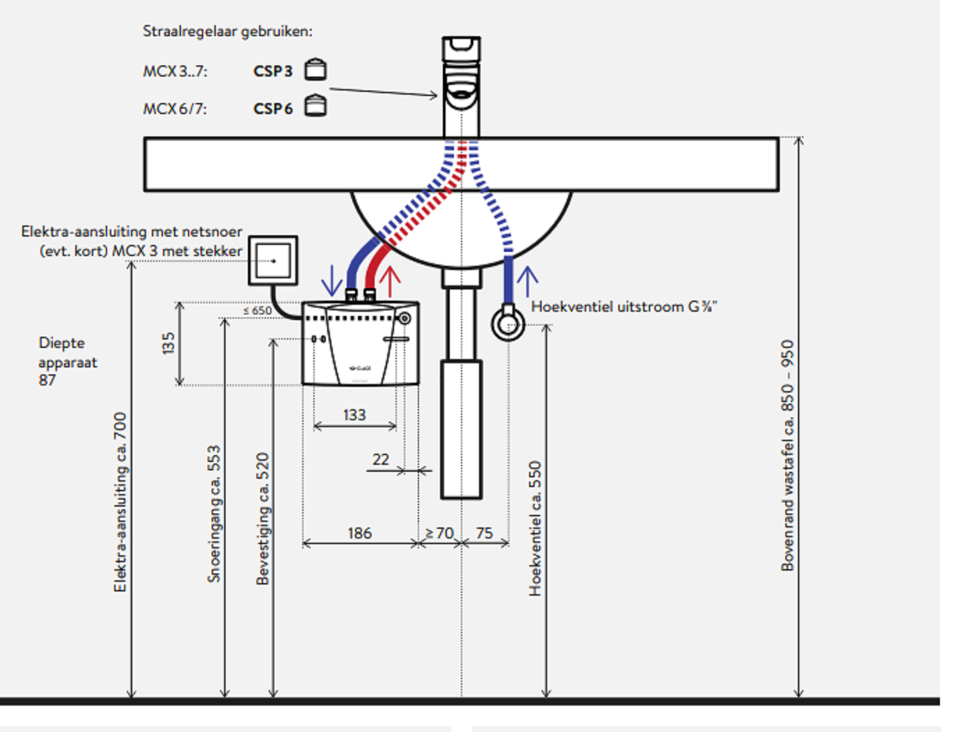 - Stekkerklaar (3,5kW), d.w.z. met netsnoer (vanaf 4,4kW), lengte: ≤ 65cm